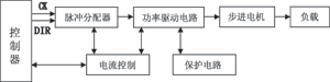 目前,对步进电机的控制主要有由分散器件组成的环形脉冲分配器、软件环形脉冲分配器、专用集成芯片环形脉冲分配器等。本设计选用第三种方案,用PMM8713三相或四相步进电机的脉冲分配器、SI-7300A两相或四相功率驱动器,组成四相步进电机功率驱动电路,以提高集成度和可靠性,步进电机控制框图见图1。