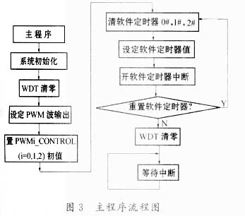 在系统主程序中,考虑到系统的安全性,前后设置WDT清零操作。在设定PWM波输出的前提下,置PWM波控制寄存器,用以和相应的软件定时器值相比较,来决定PWM波的占空比。在进行方位控制和速度调节时,只需改变定时器的值,然后调节3路PWM波输出顺序和占空比即可。