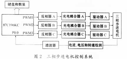 由87C196KC单片机构成的三相步进电机控制系统原理图如图2所示。该控制系统通过单片机输出3路PWM波,然后通过反相器、光电耦合器和驱动器控制步进电机的启停和正反转,而步进电机的电流、电压和转速则通过反馈回路进入单片机,并通过数显电路加以显示。电路中的光电耦合器是出于系统安全性的考虑,起隔离作用,以此把单片机输出的弱电信号和电机驱动电路的强电区分开来。驱动器采用具有较高输出电流的达林顿驱动步进电机。键盘和数显模块中,采用4×5键盘设置数字键、方位键、数显选择键和确定键等,采用Intel 8279芯片对键盘和4位共阴极LED显示器进行管理和控制。
