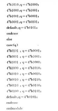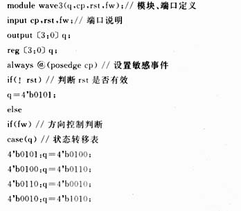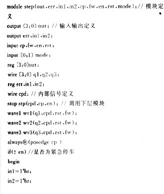 在Verilog语言中,可以将时钟信号上升沿设置为触发的敏感事件,用case语句实现状态的转移,由if-else检测正反转控制信号和rst信号。每当cp的上升沿到来时,电路输出下一状态。fw=1时,电机正转,fw=0反转,rst=0时输出复位,rst=1时正常工作。每个Verilog模块以module开头,以endmodule结束。