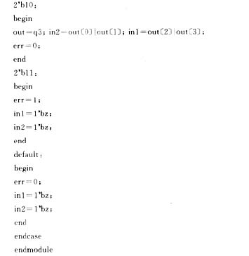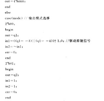顶层模块中包括有输出选择,驱动模式选择,复位控制,方向控制及全桥驱动抑制信号控制。因此,根据系统控制要求,调用上述所有的模块,是顶层模块的主要任务。当mode=00时,输出为波驱动模式,mode=01时,输出为全步模式,mode=10时,输出为半步模式,mode=11时,err=1,报错,输出为高阻态。抑制输出为in1、in2,全步模式时in1、in2输出均为1。