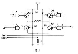 图5是L298其中一个全桥的示意图。其中,A、B两路信号分别用于控制两个桥臂,当A、B两路信号不同时为0时,驱动抑制inh=1,不产生抑制作用;当A=B=0时,inh=0,产生抑制。