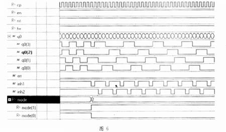 根据顶层模块的功能,我们设计了该模块的测试程序,并进行了仿真。由波形分析可见,完全达到设计要求。下面给出mode=10时,半步驱动的输出波形。顶层仿真波形如下: