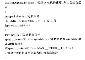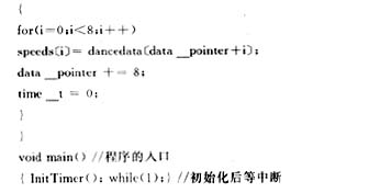 组数据(需占用1.5K存储空间,AT89C52足够)。如果人工填写这些数据,将十分困难。因此在实际的运用中,我们用C+Builder编写了机器人模拟程序,采用图形界面,预一化速度和时间信息,写入data.h,只要将其作为头文件,电机驱动程序将自动读取。