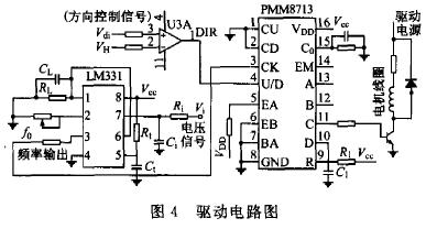 1 应用器件简介1.1 PMM8713芯片 PMM8713是由日本Sanyo(三洋)电机公司生产的步进电机控制用脉冲分配器(又称逻辑转换器),为双列直插式16脚单片CMOS集成芯片。PMM8713既可以用于3相控制,又可以用于4相控制。励磁有1相、2相和1-2相3种方式,通过电路设计可任选其中的一种激励方式。此外,PMM8713还具有单时钟或双时钟工作方式,带有正反转控制功能以及初始化复位功能,其内部有时钟选通、激励方式控制、可逆环形计数、激励方式判断等电路。 因为PMM8713所有输入端均采用施密特整形电路,因此抗干扰能力强。输出电流大于20 mA,可直接驱动微型步进电机。逻辑框图如图1所示。 1.2 LM331芯片 LM331是美国NS公司生产的性能价格比较高的集成芯片。LM331可用作精密的频率电压(F/V)转换器、A/D转换器、线性频率调制解调、长时间积分器以及其它相关的器件。LM331为双列直插式8脚芯片,其逻辑框图如图2所示。 LM331内部有输入比较电路、定时比较电路、R-S触发电路、复零晶体管、输出驱动管、能隙基准电路、精密电流源电路、电流开关、输出保护电路等。输出管采用集电极开路形式,因此可以通过选择逻辑电流和外接电阻,灵活改变输出脉冲的逻辑电平,从而适应TTL、DTL和CMOS等不同的逻辑电路。此外。LM331可采用单/双电源供电,电压范围为4~40 V,输出也高达40 V。1.3 电压-频率变换 LM331外接电路简单,只需接入几个外部元件就可以方便地构成电压/频率(V/F)或频率/电压(F/V)变换电路。本文选用LM331的电压/频率(V/F)转换功能.结构如图3所示。 外接阻容Rt、Ct和内部电路构成单稳定时电路。当输入端Vi+输入正电压时,Vi+大于Vi-,输入比较器输出高电平,R-S触发器置位,输出高电平使输出驱动管导通,从而第3脚f0输出逻辑低电平。同时,电流源IR对电容CL充电。由于复零晶体管的基极接在R-S触发器的反相输出端,因此,复零晶体管截止,电源Vcc通过电阻Rt对电容Ct充电。当Uct大于2/3 Vcc时,定时比较器输入端(第5脚)为正,因而输出逻辑高电平至R-S触发器的复位端,使R-S触发器复位。R-S触发器正相输出端输出低电平使输出驱动管截止,Vdd通过上拉电阻R0使LM331第3脚f0输出逻辑高电平。此时,R-S触发器反相输出端输出高电平使复零晶体管导通,电容Ct通过复零晶体管对地放电。电流开关打向左边,电容CL通过电阻RL对地放电。当电容CL放电电压等于输入比较器的正输入端电压Vi时,输入比较器再次输出高电平,使R-S触发器置位,输出驱动管导通,f0输出逻辑低电平。如此反复循环,从而在f0端输出一定频率的脉冲信号。根据电容上电荷平衡原理和相关电学知识,设电容的充电时间为t1,放电时间为t2。由C=Q/U, I=Q/t,Q放=Q充,可以得至I放t2=I充t1→t2UL/RL=(IR-UL/RL)t1→(t1+t2)= (IRt1RL)/UL;又f=1/T,这里T=t1+t2,所以:f0=1/(t1+t2)=UL/(IRt1RL) UL为电容C 两端的电压,因为UL在大约10 mV的范围内波动,因此,UL=Vi,故:f0=Vi/(IRt1RL) (1) 从(1)式可以看出,LM331的输出频率. f0与输入电压Vi成正比,从而实现了输入电压和输出频率的变换。t1由外接的定时元件Rt和Ct决定,其关系为t1=1.1RtCt,这样可以依据设计电路的要求相应地选取Rt和Ct的值。由内部精密电流源提供.IR=1.9 V/Rs。式(1)可变为f0= ViRs/(2.09RLRtCt) (2) 输入电阻Ri使7脚偏流抵消6脚偏流的影响,从而减小了频率偏差。Rs为可调电阻,它的作用是调整LM331的增益偏差。Ci为滤波电容,一般为0.01~0.1 uF,在滤波效果较好的情况下,可使用1uF的电容。当6脚和7脚的RC时间常数匹配时,输入电压的阶跃变化将引起输出频率的阶跃变化。为了提高精度和稳定度,阻容元件选用低温度系数的器件。