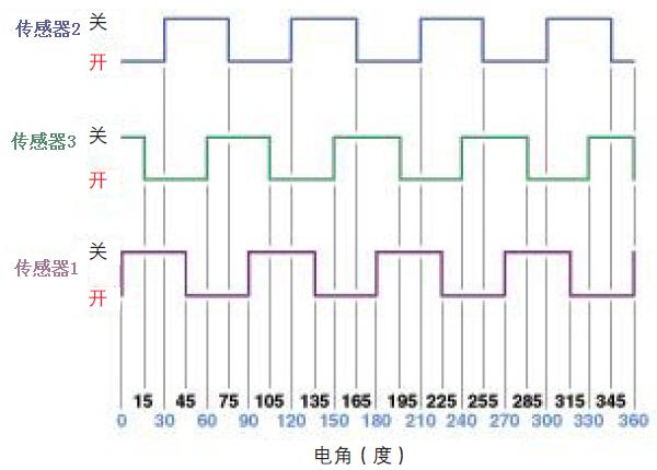 旋转的永磁体转过双极型数字霍尔传感器时,会使双极型数字霍尔传感器状态发生改变。如上图中8极磁体无刷直流电机中,每两个南极之间相隔90度,霍尔传感器相隔120度放置,此时霍尔传感器之间电角度相隔30度。南极靠近时,双极型数字霍尔传感器转换工作状态,当第一个数字霍尔传感器在0度电角度转为工作状态时,第二个数字霍尔传感器在30度电角度时工作,第三个数字霍尔传感器在60度电解时工作。