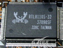 图2(点击看大图) 而Realtek的RTL8110S-32芯片,该芯片集成了Gigabit媒体访问控制器(MediaAccessController)与物理层收发器(Physical LayerTransceiver)。RTL8110S符合IEEE802.3、802.3u、802.3ab与802.3z规格,支持每秒10/100/1000兆位(Mbps)的数据传输,同时也提供这三种速率传输的自动协商功能。借着支持微软的NDIS5协议查核与大封包自动分段的TaskOffload功能、IEEE802.1p的分级传输功能以及IEEE802.1Q的虚拟局域网络(VLAN)应用,能有效降低CPU的使用率并大幅提升系统效能。