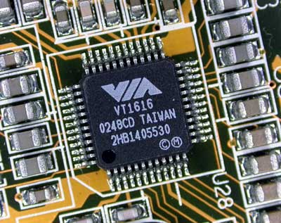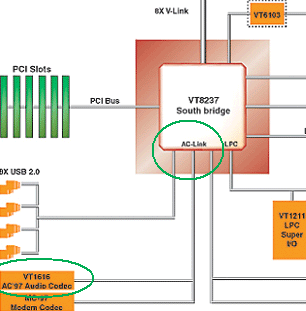 音频回放部分:AC-link连接Codec,Codec——正是我们常听说,同时在主板上也唯一能见的软声卡代表部件。只构建回放或输入部分(数模转换DAC/ADC,音频混合等功能)。就是上图右边部分了。又如右图,VT1616就是Codec。
