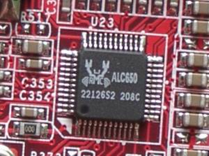 让我们先找到Codec芯片,其实很多主板会自己声明的,算是多个心眼吧,也好看看用的是什么芯片,至于具体芯片特点,容之后慢慢说明。一般再主板右上角,或者音频输出插孔附近,如下图:
