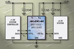SUNNYVALE, CA—July 3, 2007—Maxim Integrated Products (NASDAQ: MXIM) introduces the MAX13042E–MAX13045E* high-speed, 4-channel, bidirectional level translators with ±15kV ESD protection on I/O VCC lines. These devices provide the level shifting necessary for high-speed data transfer in multivoltage systems by operating with VL voltages from +1.62V to +3.2V and VCC voltages from +2.2V to +3.6V. Over these operating-voltage ranges, the MAX13042E–MAX13045E provide a guaranteed data rate of 100Mbps with external push-pull or open-drain drivers that source as little as 4mA output current. Offering low-voltage operation and ESD protection in a tiny, 1.54mm x 2.12mm UCSP™, these bidirectional level translators are ideal for high-speed data transfer between low-voltage ASICs/PLDs and higher voltage systems.