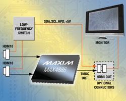 SUNNYVALE, CA—July 2, 2007—Maxim Integrated Products (NASDAQ: MXIM) introduces the MAX4886 quad, high-speed, high-bandwidth, HDMI™/DVI™ passive switch capable of switching between two digital video signals into a single monitor or multiple HDMI/DVI connectors while maintaining a high level of signal integrity. To ensure signal integrity at fast switching rates, the MAX4886 features a wide common-mode signal range that enables rail-to-rail signal switching at data rates in excess of 4Gbps. As a result, this exciting new product provides a high level of performance for general-purpose, differential-switching applications such as full line-rate Gigabit Ethernet, Fibre Channel, and telecom/networking LVDS-based backplanes. Moreover, the MAX4886's ability to multiplex two HDMI/DVI video streams into a single port enables the design engineer to address multiple applications in the consumer video and PC marketplace, such as desktop PCs, HDTVs, digital projectors, and other video applications.
