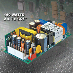 Operating at efficiencies as high as 90% with a power density exceeding 18 W/in.3, the HD160 Series of 2.00 x 4.00 x 1.06-in. ac/dc switchers can deliver 5, 12, 24, or 48 Vdc at up to 160 W.