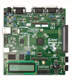 The low-cost Spartan-3AN FPGA Starter Kit helps speed application development for non-volatile applications with high system integration or security requirements. It features a 700K system gate FPGA, and is equipped with a 10/100 Ethernet PHY, 64 Mbytes DDR2 SDRAM, two 16 Mbit serial flash, A/D and D/A converters, a 2 x 16 LCD display for debugging, switches, and expansion headers.