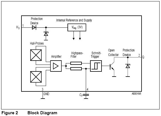 The TLE 4921-5U is comprised of a supply voltage reference, a pair of Hall probes