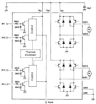 ..Keep the wiring lines thick and short in order to reduce wiring inductance between the power supply (VInsert a passthrough capacitor near the IC. (Maximum effect is obtained by inserting the passthrough capacitor between VS) and GND.Sand