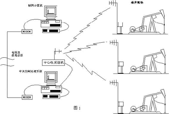 监测中心收发信机从空中接收到由油井遥控遥测主机的信号后,通过对射频信号放大、解调,恢复成数传信号送中心控制计算机处理计算,实时监测油井工况。当有异常时,中心控制计算机立即向油井遥控遥测主机发出控制命令,控制电机停机待修。
