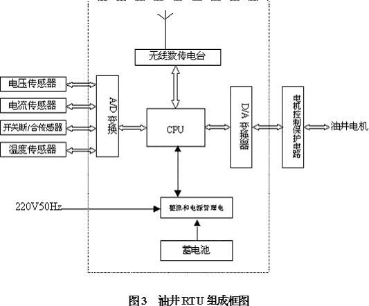 油井工作状态传感器主要有温度传感器,电压传感器,电机电流传感器,被监控开关断/合传感器,它们将油井的工作状态变换成对应的电压或电流值送至远程智能无线RTU。本系统留有扩展接口,可根据油井实际情况增加。