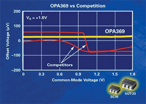 Offered as the industry’s lowest-power zero-crossover operational amplifier, the OPA369 achieves rail-to-rail performance without input crossover to solve the common design problem of input offset distortion due to the change in common-mode voltage that is very prominent in low-voltage rail-to-rail applications. Featuring 1-µA quiescent current, an SC70 package, and operation down to 1.8 V, the op amp simplifies high-performance designs in battery-powered portable products.