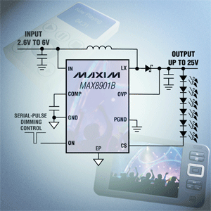 Achieving up to 92% efficiency while driving a string of two to six white LEDs, the MAX8901A/MAX8901B white-LED drivers are offered as the smallest and highest-efficiency devices of their kind. The parts come in 2 x 2-mm TDFN packages and offer a fixed 750-kHz typ switching frequency, enabling the use of 1-µF input and 0.1-µF output capacitors.