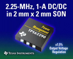 Supporting low-power DSPs and microcontroller-based portable electronics and extending battery life in Li-ion battery-powered applications, the TPS62290, TPS62260, and TPS62240, 2.25-MHz step-down dc/dc converters come in 2 x 2-mm SON packages. The 300-mA (TPS62240), 600-mA (TPS62260) and 1-A (TPS62290) synchronous, step-down dc/dc converters regulate output voltages down to 0.6 V, with ±1.5% accuracy.