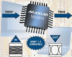 The MAX3814 is compatible with HDMI 1.3 and is available in a small, 32-pin TQFN package that is fully specified over the 0°C to +85°C temperature range. Prices start at $1.95 (1000-up, FOB USA). An evaluation kit will be available to speed designs-please contact the factory for details.