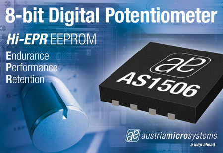 austriamicrosystems (SWX: AMS), a leading global designer and manufacturer of analog ICs for communications, industrial, medical and automotive applications, today expanded its digital potentiometer portfolio with the AS1506, an 256- tap SPI-interfaced nonvolatile digital potentiometer available with 10, 50 and 100kOhms resistance.