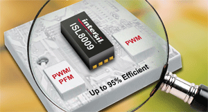 The ISL8009 1.5-A synchronous buck integrated FET regulator allows selection between forced PWM mode and automatic PWM/PFM mode, enabling the regulator to maintain up to 95% efficiency in both full-load and light-load conditions. The product features a 1.6-MHz switching frequency, which allows the use of smaller external components. It also has internal current-mode compensation that helps eliminate external components and contributes to fast transient response in overcurrent conditions.