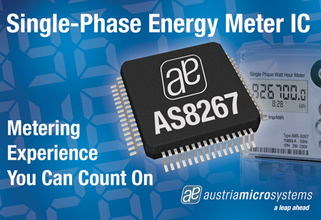 “The unsurpassed accuracy performance of the AS8267 for all measured parameters, including active energy, MAINS voltage and MAINS current, also makes the AS8267 a leader in its field,” adds Dave Simpson, applications manager for metering products at austriamicrosystems. “The precision measurement accuracy is consistently repeatable for all measurements.”