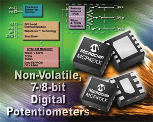 The 7- and 8-bit MCP4141/2, MCP4241/2, MCP4161/2 and MCP4261/2 nonvolatile digital potentiometers have an SPI interface, consume 5 μA, and are specified over the extended industrial temperature range of 40 to 125C.