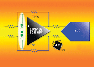 The LTC6406 A/D converter provides a rail-to-rail input stage and an independently adjustable output common-mode range. Features include a gain-bandwidth of 3 GHz, a unity-gain −3-dB bandwidth of 800 MHz, a noise figure of 1.6 nV/√Hz, and a current consumption of 18 mAwhich can be reduced to 300 µA during inactivity mode.