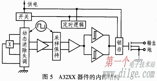 A32xx系列产品的内部结构如图5所示。图中,X为霍尔传感器。电路工作时,霍尔传感器、动作失调消除电路、小信号放大器、采样保持器电路共同完成测量与稳零,而后经过放大后进行施密特整形,并在唤醒脉冲的下降沿将整形结果锁存,再经MOS-FET驱动输出。定时逻辑用于实现器件的唤醒和休眠周期的控制。在休眠阶段,开关断开,此时除定时逻辑和锁存器外,其它电路均不工作,降低了功耗。