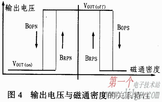 A32xx系列与一般的霍尔开关不一样,该系列无论对N极还是对S极磁场,只要垂直于器件且磁通密度达到其动作点Bopn或Bops以上,都会使器件开关导通输出为低,此时器件可以吸收1mA的电流。只要磁通密度降低到释放点Brpn或Brps以下,都会使器件开关断开输出为高。磁通密度动作点和释放点的差异称为器件的磁滞Bhys。该磁滞特性可保证即使出现外部振动和电气噪声,器件的开关过程均无抖动。图4给出了该系列器件的输出电压与磁通密度的关系特性。