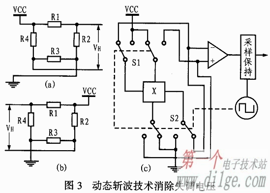 霍尔器件可以被看成类似于惠斯顿电桥的一组电阻阵列,这些电阻的匹配是造成器件失调的主要因素,而器件的成型过程、热应力和温度系数则是造成电阻不匹配的最主要因素。A32xx系列产品采用动态斩波技术消除失调,并通过内部集成的高频时钟控制CMOS开关来动态改变流过器件的电流方向和霍尔电压测量端内部采样保持电路所捕获的霍尔电压信号,然后通过低失调的双极电路进行处理,以使得电阻不匹配所造成的残余失调电压能相互抵消。该技术使A32xx器件具有极稳定的静态霍尔输出电压,而与热应力无关。图3为该技术的工作过程示意图,其中图3(a)、(b)为技术原理图、图3(c)为电路技术结构图。