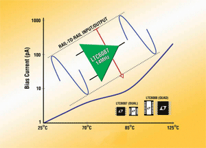 Offering rail-to-rail input and output stages, the dual-LTC6087 and quad LTC6088 amplifiers achieve 750-μV max offset voltage, 14-MHz GBW, 1-pA bias current, and 1.25-mA max current consumption per amplifier.