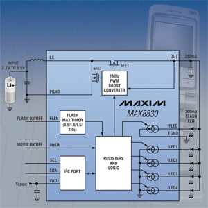 The MAX8830 LED light-management IC in a 2.5 x 2.5-mm UCSP package integrates a dc/dc step-up converter, four current regulators for display backlighting, a camera-flash current regulator, and all power switches. The >90% efficient device suits cellular handsets, wireless PDAs, and smart phones.