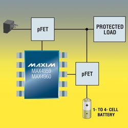 - The MAX4959/MAX4960 protect low-voltage systems up to 28V and switch to the battery when an external AC adapter is unplugged.
