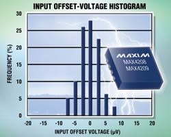 The devices' input stage uses CMOS transistors with 1pA (typ) input bias current. Input offset voltage is 20µV (max) at +25°C, 30µV (max) at +85°C, and 40µV (max) over the 40°C to +125°C temperature range. The offset voltage distribution in Figure 2shows that the devices' typical input offset voltage is less than 5µV.