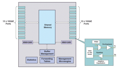The chip’s 35 x 35-mm package integrates advanced Ethernet Layer-2, data-center bridging, QoS, VLAN and QinQ, and Layer-3 capabilities, a 2.9-Mbyte buffer memory, and PHYs for all ports. Along with 26 multirate 10-GbE single-lane ports, it has a pair of 10/100/1,000-GbE management ports.