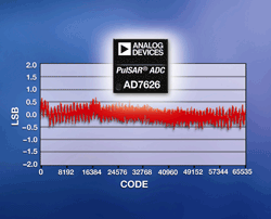 In addition, the AD7626 consumes 130 mA and uses a self-clocked LVDS bus that provides a very-low-noise interface and reduces the number of external components required to address board-level noise concerns. Also available, is the AD7625, a 16-bit PulSAR ADC that operates at 6 Msamples/s. (Ea/1,000: AD7626, $34; AD7625, $32 available now.)