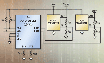 Housed in a 14-pin TDFN package, the DS4422/DS4424 sink/source D/A converters use a current change at the feedback node to manipulate the power-supply output voltage, thus allowing the devices to be connected to an existing power supply without redesign. These I2C-controlled, 7-bit current DACs feature two (DS4422)/four (DS4424) output channels that are specifically designed for power-supply margining and adjustment.