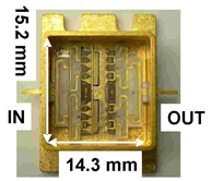 The new GaN HEMT-based amplifier (Figure 1) Fujitsu Laboratories has developed is comprised of two transistor chips which resolve the aforementioned technological issue, while producing high output. Key features of the new C-band GaN HEMT-based amplifier include the following:
