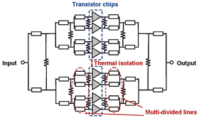 - Employs multi-divided input pathways to prevent occurrence of phase differences to the input signal between the transistors (Figure 2). This enables GaN HEMTs with high output power densities to operate uniformly and efficiently combine their output power.