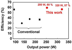 Fujitsu Laboratories developed two C-band GaN HEMT amplifiers with excellent characteristics - one that features 320W output power with 57% efficiency, another featuring 250W output power with 60% efficiency, both which feature the world's highest output performance for the C-band and which significantly outperform the best previously-reported performance for high-output amplifiers above 100W, which was 220W per package (Figure 3). The 320W amplifier exceeds the output power of conventional GaAs amplifiers more than 6-fold (comparison by Fujitsu), which will enable the extension of wave transmission ranges by 2.4 times.