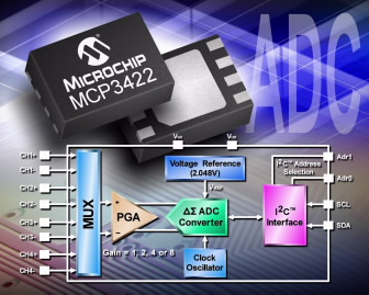 CHANDLER, Ariz., Nov. 11, 2008 [NASDAQ: MCHP] — Microchip Technology Inc., a leading provider of microcontroller and analog semiconductors, today announced a new series of low-power, high-resolution Delta-Sigma Analog-to-Digital Converters (ADCs). The MCP3422, MCP3423 and MCP3424 (MCP3422/3/4) ADCs provide 18-bits of resolution and consume only 135 micro Amperes at 3V continuous conversion. The multi-channel devices have an integrated voltage reference, Programmable Gain Amplifier (PGA) and oscillator onboard, and are available in packages as small as a 2 mm x 3 mm DFN. They are ideal for portable measurement applications in the industrial, medical, consumer and automotive markets, among others.