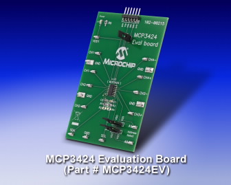 Microchip also announced the MCP3424 Evaluation Board today (Part # MCP3424EV), to help designers get started using the new ADCs in their designs. The board enables the user to evaluate the performance of the MCP3424 ADC by interfacing to the PICkit™ Serial Analyzer (Part # DV164122). It is available at microchipDIRECT (www.microchipdirect.com) today, for $15.