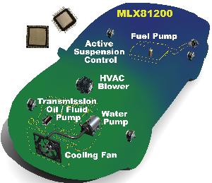 The MLX81200 enables new applications in the world of sensorless BLDC motors. The reliable and wide dynamic operating range, the very low speed operation capabilities – reducing battery drain during engine stop condition – and the high integration make the MLX81200 the ideal solution for water pumps and transmission oil pumps in hybrid powertrains. Additionally BLDC fuel pumps, active suspension control, engine cooling fans and HVAC blowers benefit when using the new Melexis device.