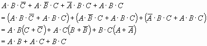1时,输出为1的电路称为表决逻辑电路。这里,设有3个输入时的情况。3个输入中过半数为1有图5.21所示的4种情况。其真值表如表5.5所示(只表示输出为1的条件)。图