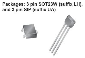 两种封装类型能为大多数应用提供磁性优化的封装。后缀 LH 是一种SOT23W表面安装封装,而后缀UA则是采用过孔安装的三引脚超微型 SIP。