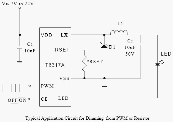 T6317A一路输出,最大达350MA,用户可以根据自己的需要来调节,T6317A的封装形式为SOP-8和TO-252,主要应用于:1W和3W低压MR16、手电筒、台灯、灯杯、射灯、投光灯等。