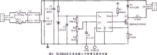XLT604是可降压、升压、升降压驱动大功率LED串的控制芯片。该芯片既适用于AC输入,也适用于8~450 V的直流输入。交流输入时,为提高功率因素,可在线路中加入无源功率因素校正电路。XLT604可驱动上百个LED的串联或数串并联,并可通过调节恒流值来确保LED的亮度并延长寿命。PWM_D端可采用低频脉宽调制的方法调节LED亮度,同时兼作使能端,该端悬空时,芯片无输出控制。实际上,该芯片也可以通过LD端的线性调压方式调节LED的亮度。图2所示是XLT604在交直流输入中的典型应用电路。